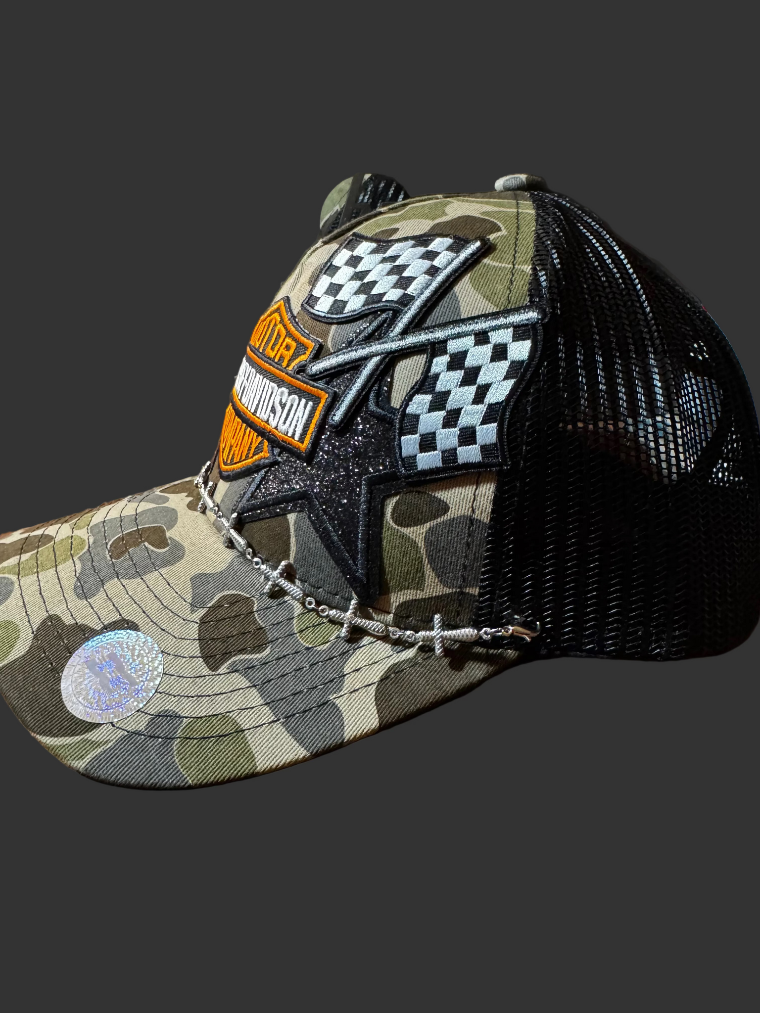 One size fits all, camo trucker hat with black mess in the back. HD and other patches- silver cross chain